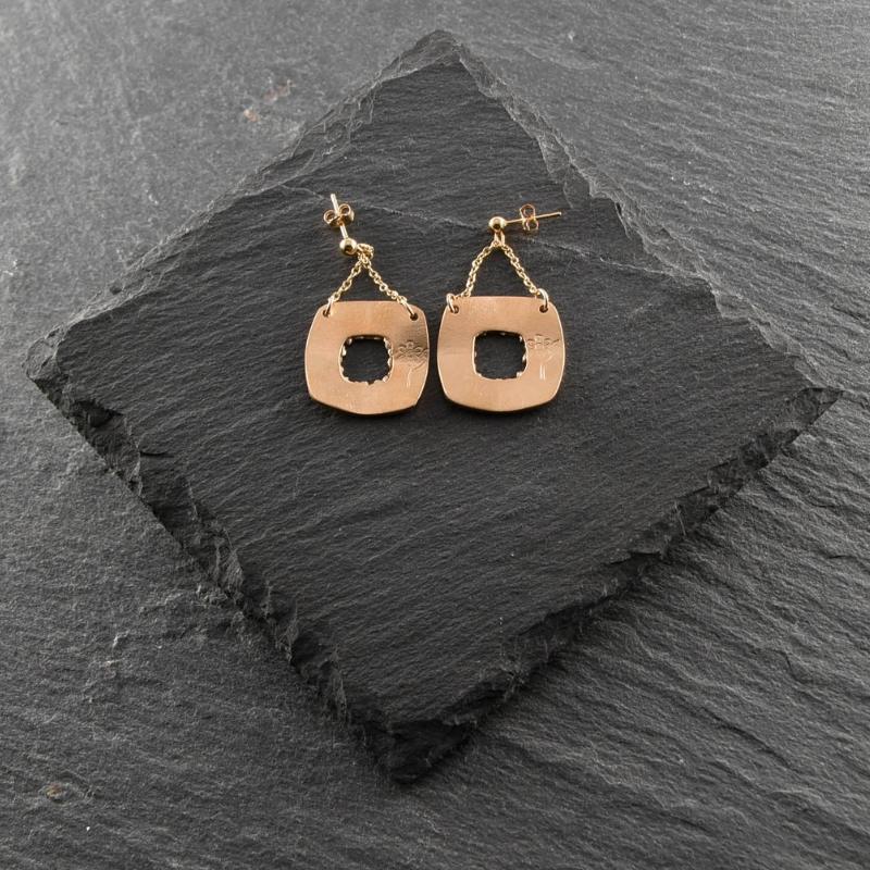 Boucles d’oreilles carrées en bronze doré brossé – bijou artisanal finition satinée