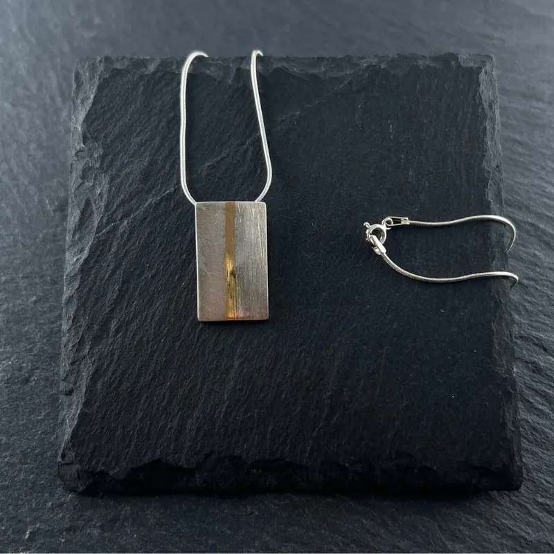 Collier rectangulaire en argent massif rehaussé d’une ligne d’or 24 carats appliquée au keum-boo. Un bijou contemporain, graphique et unique, façonné à la main.